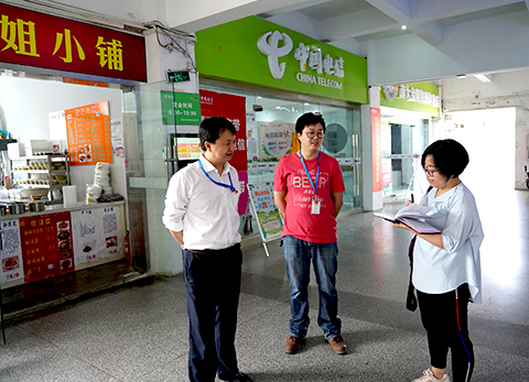 2019年6月6日上午,山西大学商务学院经济学院辅导员董蓉、后勤服务总公司饮食服务中心副主任李志宏两位老师来我校后勤服务中心进行“高校后勤‘三育人’评价指标体系”相关的考察调研,后勤服务中心办公室主任聂守宏、餐饮部副部长王永祥、物业部副部长蔡小荣、校园部副部长殷疆及各部门相关人员接待并参加调研座谈会。