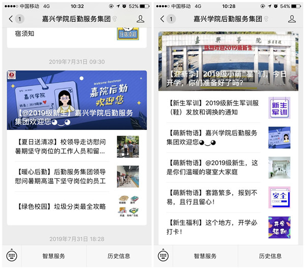 “嘉兴学院后勤服务集团”微信公众号及时推送校园后勤服务指南、寝室环境介绍、军训服发放、新生解惑、床上用品订购等后勤服务信息。综合办公室提前制作好迎新宣传橱窗内容,精心设计了《后勤服务集团迎新服务指南手册》,提前将指南折页册分发到各新生宿舍(公寓)楼和三个迎新点,方便新生在报到时领取;服务指南高度浓缩、以一问一答的形式解答校园生活疑问,帮助新生快速适应新的学习生活环境。