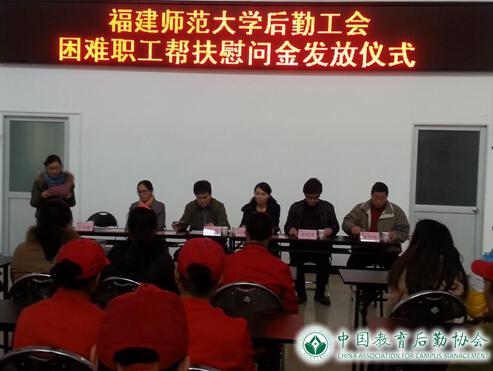 福建师范大学2014年度“后勤工会困难职工帮扶慰问金”发放仪式于2014年12月23日下午在饮食服务中心举行。后勤管理处副处长、后勤服务集团副总经理张鹏程,后勤工会副主席何梅玲,饮食服务中心领导班子、各餐厅负责人及饮食服务中心全体受帮扶对象参加了慰问金颁发仪式。