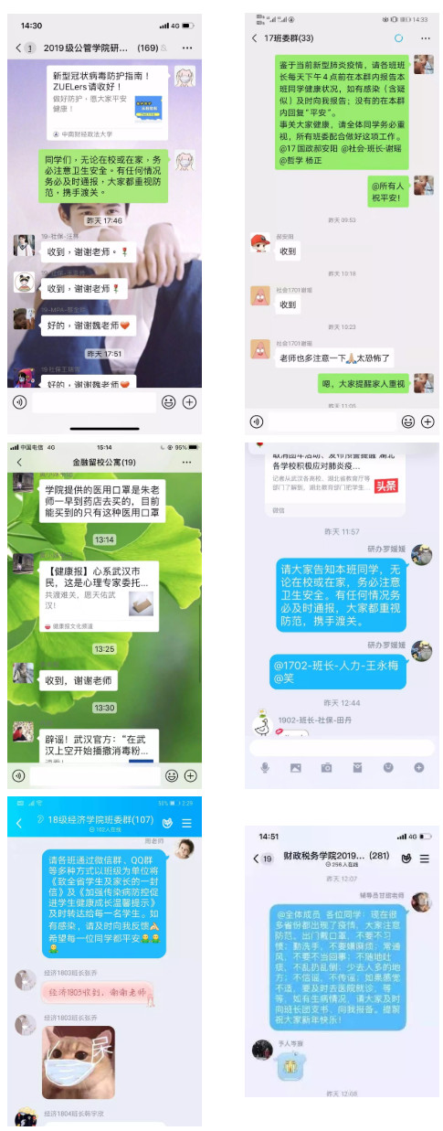 各个学院也第一时间关注学生健康状况,积极推行学生健康状况日报制度,针对大部分学生寒假放假在家的实际情况,教师班主任、辅导员等通过线上、电话等方式向学生宣传新型肺炎防护知识,同时及时掌握学生健康状况,为做到早预防、早发现、早治疗奠定基础。
