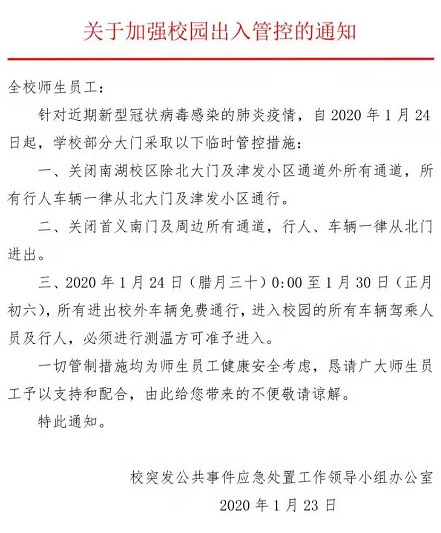 保卫部及时将口罩等防护物资发放到一线执勤人员,同时采取校园出入管控措施,从1月24日起,对两校区部分大门进行关闭,对从规定大门进出的车辆和人员进行测温,切实降低外来风险。