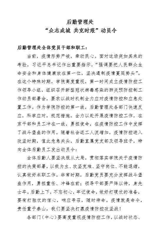 为进一步发挥后勤直属党支部战斗堡垒作用,发挥党员旗帜作用,冲在一线把群众带动起来、凝聚起来、组织起来,全面构筑联防联控、群防群治的严密防线,守护师生幸福安康,后勤直属党支部于防控时期成立了疫情防控党员突击队,并向后勤全体党员发出了“众志成城 共克时艰”动员令。