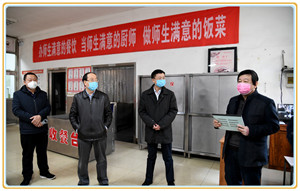 在疫情防控工作最吃劲的关键阶段,2020年2月13日上午,山西大学校长、校疫情防控工作领导小组组长黄桂田,校党委副书记李富明、纪委书记韩勇鸿、副校长卢宇鸿一行在山西大学党委办公室、校长办公室、党委宣传部、纪检委、保卫武装部、国有资产管理处、后勤管理处、校医院等部门负责人陪同下采取不打招呼、直奔防控一线的方式,在检查和调研完大东关校区防控重点部位后再次深入坞城校区继续开餐的教工餐厅现场检查指导疫情防控工作,看望慰问在岗工作的餐厅工作人员。
