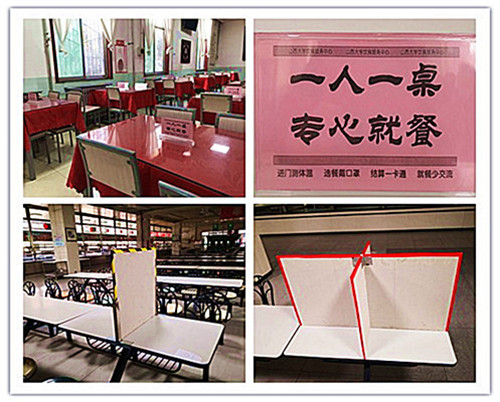 一是在当前疫情防控物资紧缺的情况下,为缓解生活物资紧张现状,山西大学饮食服务中心提前谋划,为开学做必要的物资储备,为保障疫情防控期间,特别是开学学生返校后学校师生饮食需求和食品安全,饮食服务中心提前做好食材储备,确保疫情防控期间学校师生饮食保障,同时,还到市场了解了快餐盘、饭菜打包盒等餐具的价格、库存等情况。二是安排专人对餐厅各部位喷洒消毒剂,深入开展卫生整治,彻底清除各类病媒生物孳生环境,推进餐厅等重点区域和场所环境卫生改善整体行动,全力营造一个干净卫生的环境迎接师生返校。三是安排维修人员全面检修窗户,便于学生返校后开窗通风;全面检修餐厅各场所紫外线消毒灯,确保完好可用;四是请专业人员制作餐桌隔板,就餐师生一人一格,做出样品后请领导来审核;五是为当前开餐的教工餐厅制作了提示台签,提醒就餐人员“一人一桌,专心就餐”。