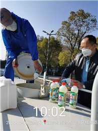 二、与员工一起科学配比消毒剂;交待员工对校内公共区域、家属区、停车场、电梯走道等重点区域进行消毒工作;亲自监控对校内进行的定期喷洒消毒。