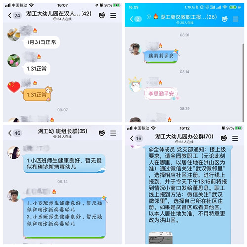 组建在汉、离汉教职工信息群,每日由专人负责统计教职工身体状况,对于未回复身体状况者,则及时通过微信、电话等形式确认;各班班主任通过QQ群每日报送本班幼儿及家长身体状况,信息汇总之后上报教育局相关部门。所有党员和常居住地在洪山区的教职工都完成了“武汉微邻里”线上报到,做到网上报到全覆盖。