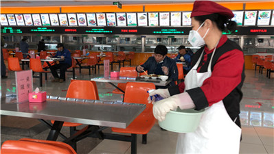 饮食服务中心严格加强工作人员的管理,从各个防控细节入手将防控风险点降至为零。对所有上岗员工实行校园封闭式管理,在防控期间不允许出入校园。返京人员严格进行14天医学观察,身体状况良好方能上岗。将员工宿舍调整为每2人一间,人均面积8平方米,每天对宿舍内进行两次全方位清洁消毒,值班人员严格巡检。所有人员每天自行进行三次体温监测并做好记录,做好个人卫生防护,严格执行“四勤”、“四净”制度,每日上报身体健康状况,确保每名员工身体健康无异常。每天进行两次疫情防控知识的集中培训,提高人员防范意识、普及防控知识、规范操作流程。