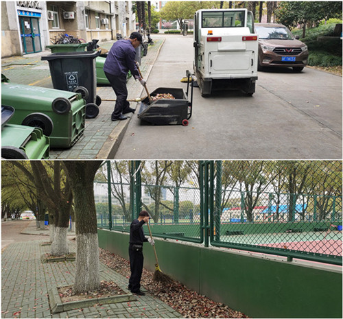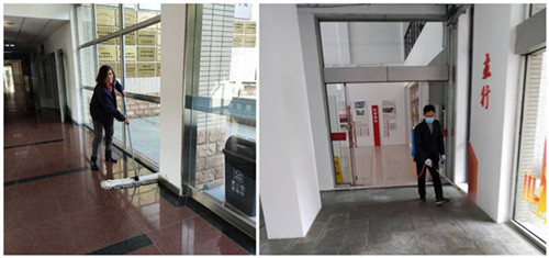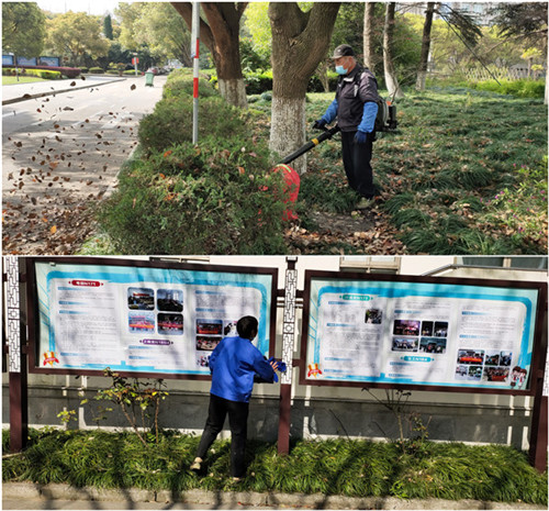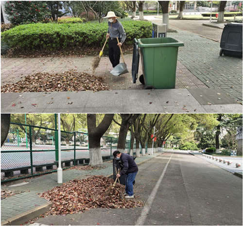 疫情期间,正值寒假,留守在学校的物业员工只有二分之一,正是这40余名物业员工,担负起了校园清洁消杀等重要工作。每天早晨,保洁人员上岗,他们在进行上岗前体温检测、洗手消毒、佩戴口罩后,开始投入一天的工作。保洁员首先对校内主干道、人行道路等区域进行日常清扫、捡拾,随后认真做好校园环境卫生和消杀预防工作。保洁员按照“环境卫生不留死角,清洁消毒不留空白”的工作要求,加强重点部位消毒,每天用84消毒液进行喷洒消毒,包括门把手、水龙头、电梯按钮、楼梯扶手等高频接触物体表面积;全力做好校园楼宇内及公共区域的卫生保洁、喷洒消毒工作;认真做好楼内值班登记管理,经检测体温正常的师生员工,方能进入相关楼宇。同时加强对垃圾分类的管理与处置,在行政楼、教学楼、学生宿舍(公寓)楼、教职工宿舍楼等主要场所设立“废弃口罩”垃圾回收箱,每日定时使用75%酒精或含氯消毒剂对垃圾回收箱进行消毒处理。负责越秀校区教工1号宿舍楼的保洁员黄建林,每日做好越秀校区教工1号宿舍楼的消杀工作、垃圾清理工作,他与物业员工肖林、邓公平等组成校园消杀小队,每日定时对校园所有楼宇的出入口区域进行消杀。园林绿化养护人员定时定期对校园树木进行修剪、浇水、撒药除虫,静待疫情过后的春暖花开,以最美丽最整洁的校园迎接每一位“嘉人”的归来。
