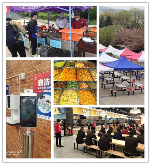 一是精心做好饮食服务保障工作。根据学校春季学期开学的总体部署和统一安排,为做好近4万名师生的饮食服务,确保“舌尖上的安全”,总务部根据疫情期间堂食的有关要求,在做好食堂环境卫生清洁和消杀及工作人员管控的前提下,提前制定并认真实施工作方案。按照堂食的“不能面对面、保持适当距离、限制同时就餐人数”的要求和减少堂食同时就餐学生集聚的目的,总务部采取“错时下课、错峰吃饭;增设网点、多点销售;延长供应、增加时间;预约订餐、打包带走;自备餐具、供应盒饭;制作隔板、增加堂食;搭建帐篷、户外就餐”的方式创新饮食服务。所有餐厅均正常开放,早餐从上午6:30开餐延至9:00,午餐从11:00开餐延至14:00,晚餐从17:00延至19:00,南湖校区和文昌校区还分别专门安排书香餐舍、音乐餐厅和嘉园餐厅的晚餐供应时间延至22:00;鼓励学生带离用餐,凡自带餐具者均免费赠送水果、牛奶等,教职工微信接龙提前预约;在食堂餐桌上制作“十字型”隔板,避免大家面对面交流,增加堂食的人数;在松苑餐厅前的南侧和东侧的广场上搭建帐篷,放置了桌子和椅子,设置“临时售卖点”,增加了近120 个就餐座位,实行户外就餐;提醒学生做好个人自我防护,在餐厅内外设置了洗手池并配备了洗手液,同时在餐厅内部的售卖窗口前设置了间隔为1米的多条隔离带,使得学生做到“不接触取餐”。