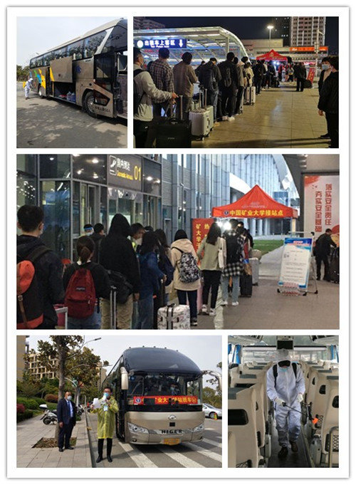 四是用心做好学生返校接站工作。按照学校工作统一部署,我校定于4月15日起为学生错峰分批返校时间,为做好2万多名需要学校安排专车接站(机)学生的安全、有序、平稳入校,学校学生返校报到迎接工作组分别在徐州站、徐州东站、汽车南站、淮西客运站、观音机场设置迎接点,细化迎接工作方案,明确岗位分工、抽调党员骨干、培训学习操作、模拟推演全流程、接洽站点车站城管公安各方、实地考察布局、统筹防护物资、与车企共商方案、细化细则实施、约谈消除顾虑等。4月13日,专门开展接站各类情况的演练工作;接站组主动做好接站时标识指引、数据分析、调度车辆、防疫宣传、消毒测温、核验身份、查验彭城码、检验车票、登记信息、引导乘车、统计人数、核实发车、应急处置等具体步骤。为便于溯源,实行按车对号入座留痕,通过实行进站点测温、乘车前测温的“双测”以及部分情况复杂站点启用热成像测温仪进行群体扫描抽查、陪同人员不得乘车、全程不开启空调、固定行驶路线、非站点不停车、车辆必消毒再出发等具体措施来保障返校师生安全,守护校园平安。对个人防护物资准备不足的同学,现场及时发放了口罩、手套、雨衣,并为候车较长时段的同学发放了面包、饮用水、盒饭等。