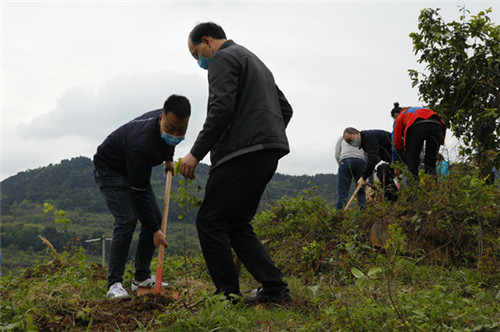 上午9:30,党员代表们佩戴党徽,准时来到位于龙泉驿区山泉镇观斗村油房垭的一片未开垦的坡地。骤降的气温泛着凉意,但大家植树添绿热情不减,大家各司其职、分工协作,一起立苗、培土、踩实、打围、浇水,认真做好每一道工序,细致种下一颗颗小树苗。