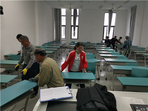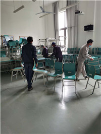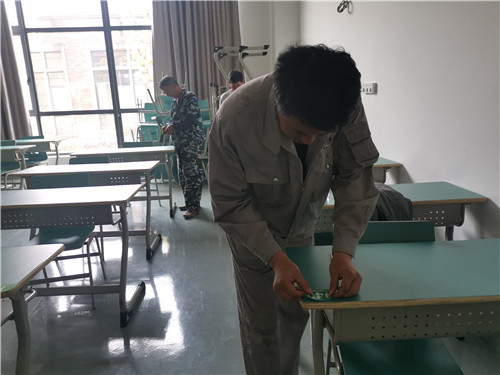 为保障后续师生工作、学习安全,物业服务中心杂工组利用“五一”假期时间,陆续对工科楼、教学楼等64间教室进行了布局改造。通过搬运调整5600余张桌椅、粘贴防疫知识宣传、粘贴桌椅序号等方式以达到减少教室使用人数的目的,降低传染风险。
