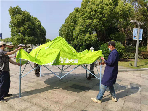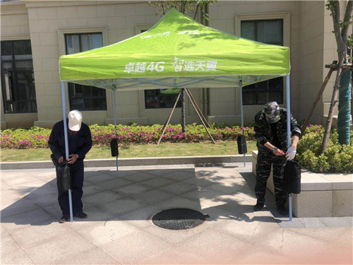 另一边,杂工组一早便抵达接站点布置场地,快速搬运放置桌椅、搭建帐篷、布置接待学生的太阳伞等,完成后便马不停蹄地返回学校,投入到学生行李消毒、日常防疫工作中。