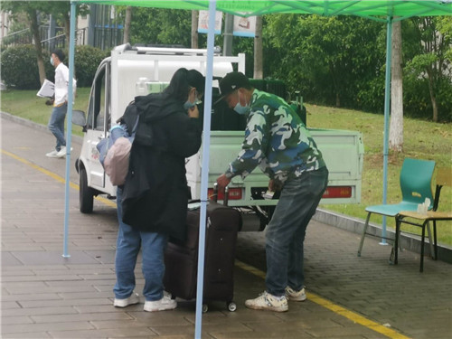 为此,物业服务中心推出了爱心电动车搬运服务,三辆电动车于北一门附近待命,轮流出发为有需要的学生提供服务,搬运大件行李。期间由于人手不足,办公室人员也加入了爱心服务小队,从早到晚,一齐使劲,为此次返校复课添砖加瓦,截止5月8日累计搬运大件行李250余车次。