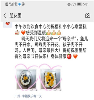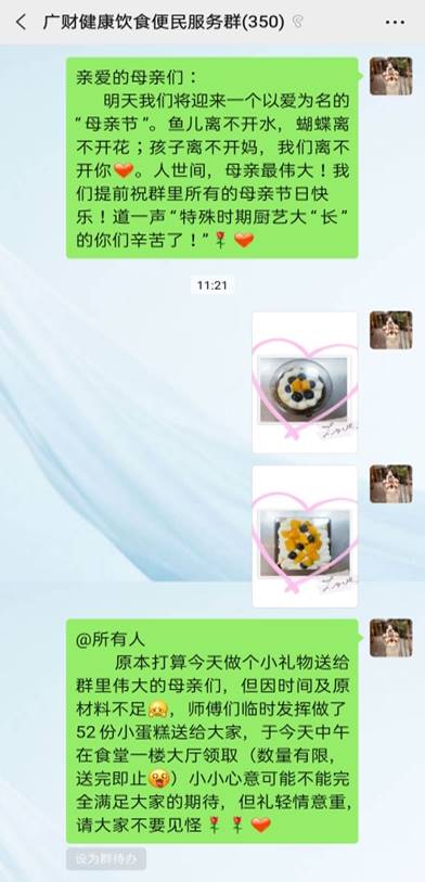伴随着康乃馨丝丝缕缕的幽香,我们迎来了以爱为名的“母亲节”,为了让在校的母亲们度过一个温暖的节日,5月9日中午,广东财经大学广州校区学二食堂准备了“母亲节小蛋糕”,送给在这特殊时期里坚守岗位的母亲们,并送上母亲节祝福。