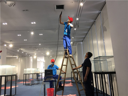 在空调消杀之前,物业服务中心提前谋划、周密安排,根据每日空调消杀工作量,适时配置3-5名工作人员,现场协助并监督施工进程,避免出现空调清洗不到位、漏洗以及施工中损坏楼内物品的现象。在施工过程中,物业服务中心工作人员现场协助各部门、各学院开门锁门,引导空调清洗人员到达位置,避免因其对楼内空调布局不熟而导致时间浪费。对于图书馆、博物馆等场所,因藏书、化石展品珍贵,消毒剂不能直接接触,因此物业服务中心工作人员全程密切配合清洗人员,用一次性塑料薄膜把裸露在外的物品,全部遮盖起来。消杀结束后,积极协助完成收尾工作,关闭门窗,并做好清洁,以便老师正常办公,学生正常复学。