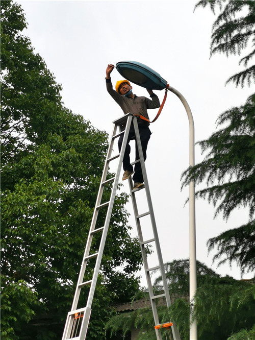 入夏之后,学校用电量大增。这天中午,修建服务中心校本部零修站接到了后勤服务热线的电话:南校区有一部分路灯突然不亮。站长邓伟文马上安排一组人员和能源管理中心一起路灯送电,查清损坏路灯的具体情况,另一组人员到仓库准备各种维修材料、升降楼梯等工具。半个小时后,路灯损坏情况基本摸清,维修材料也已到达现场,只见有师傅戴好安全帽、系好安全绳,带着包好的工具和材料灵敏地爬上了高高的升降梯,有的师傅们则在地面检修开关和线路、准备灯泡等材料。一盏路灯修完,大家推着小推车又继续下一盏。天气炎热,戴着安全帽和口罩的师傅们汗水直流,可是没有一个人说苦叫累。陆陆续续,校园里路灯一盏一盏亮了起来,映照着师傅们满脸的汗水、欣慰的笑容。