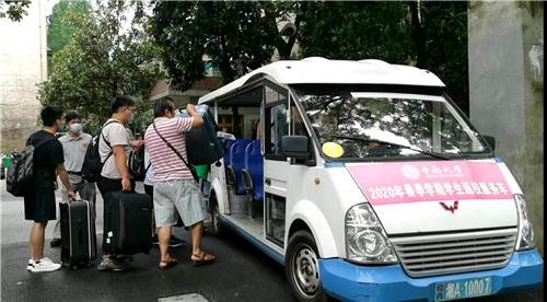 生活服务中心成立“春季学期学生返校服务车队”,用观光车为校本部的返校毕业生提供便利;恢复校内快递服务业务,方便毕业生托运行李,周到服务很是贴心。