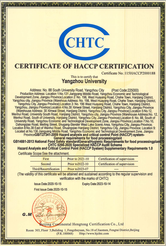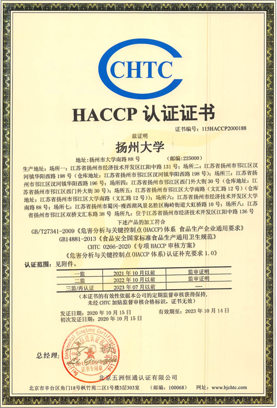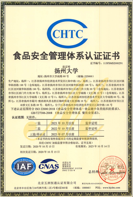 近日,扬州大学顺利通过ISO22000:2018食品安全管理体系/HACCP体系认证并取得证书,成为全省首家大学生和幼儿食堂全覆盖通过该认证的校园餐饮单位。