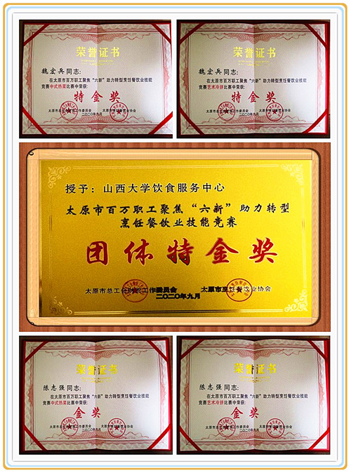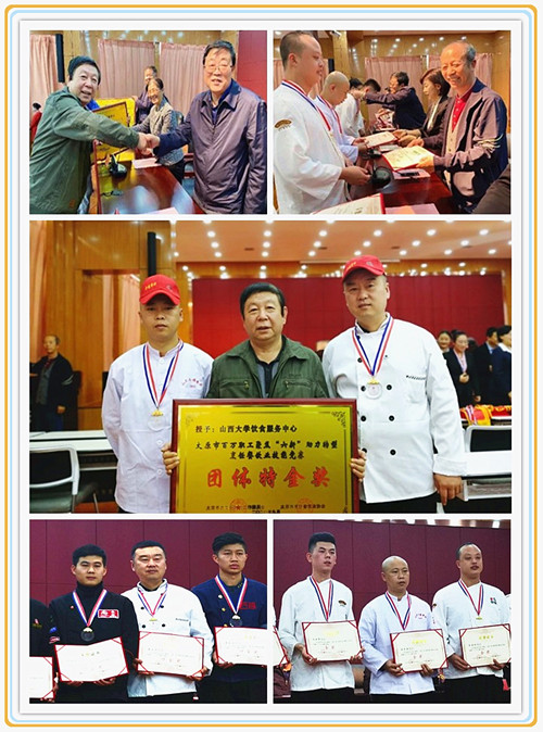 在欢快热烈的气氛中,各位领导为分别在太原市百万职工聚焦‘六新’助力转型职业技能竞赛烹饪餐饮业比赛中荣获团体特金奖、突出贡献奖、贡献奖单位及荣获特金奖、金奖、银奖的选手颁发奖牌和荣誉证书。山西大学饮食服务中心在本次竞赛中荣获团体特金奖,魏宏兵、陈志强两位师傅分别获得烹调、冷拼特金奖。