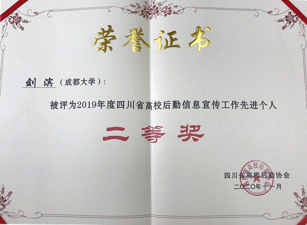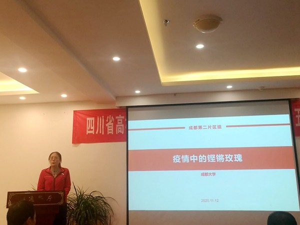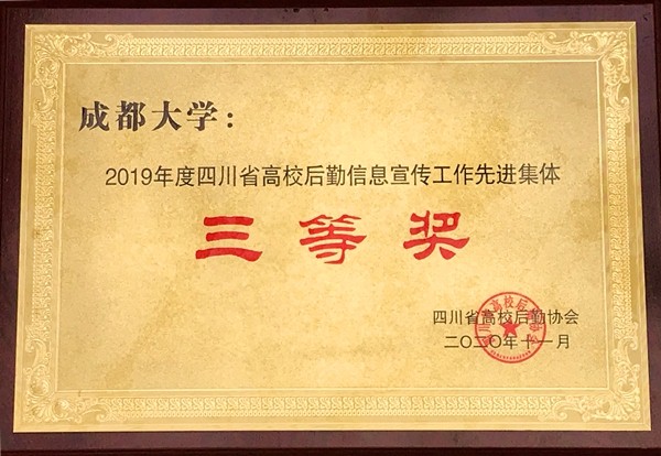 2020年11月12日,成都大学后勤处党总支书记黄沛率队参加在雅安召开的四川省高校后勤协会思想政治工作委员会第四届五次年会。会议表彰了四川省高校后勤协会2019年信息宣传工作的先进集体和先进个人。成都大学荣获先进集体三等奖,职工刘滨获得先进个人二等奖。后勤处综合科科长虞海霞上台领奖,并代表成都第二片区组以《疫情中绽放的铿锵玫瑰》为题讲述成都大学后勤人的抗疫故事。