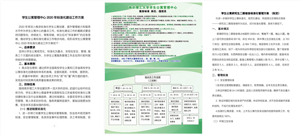 严格按照全国高校学生公寓和江苏省高校学生公寓标准化创建指标体系的标准,围绕“整合学生公寓管理机构、完善学生公寓管理制度、提升公寓管理服务水平,改善学生公寓住宿环境”四大任务目标,制定《南京理工大学学生公寓管理中心标准化建设总体方案》、《服务标准化条款及对标情况》及《岗位执行标准》。