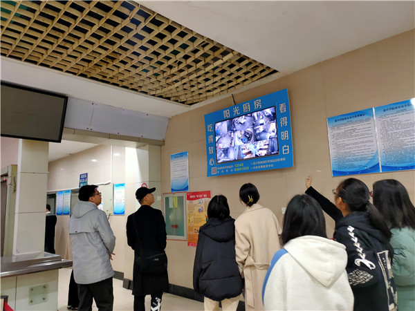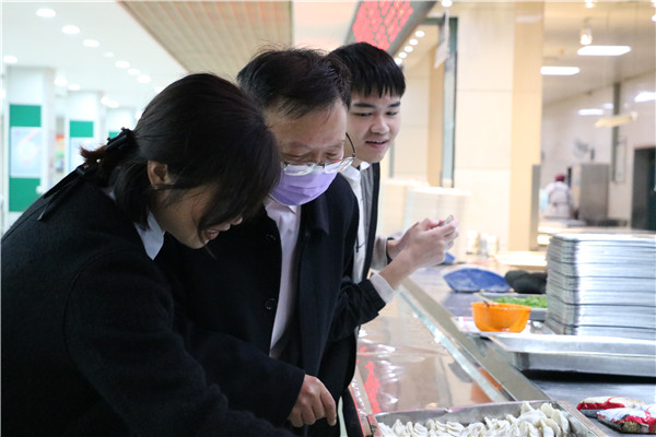 此次体验活动主要包括参观食堂后厨、了解阳光厨房以及亲手包饺子。在参观“阳光厨房”过程中,同学们在越秀校区春华苑自选餐厅主任的带领下,走进后厨参观,了解食堂日常工作。食堂主任为同学们介绍了食堂的基本情况,详细讲解了集团采供服务中心和饮食管理服务中心在食品原材料采购、储存、生产和加工等方面的安全管理和监控措施。同学们先后参观了食堂主食加工间、切配间、洗碗消毒间、食品留样处、安全公示栏、原材料仓库等,观摩了食堂工作人员切配、烹饪、食品加工等工作环节。同学们就食品原材料采购渠道、餐具清洗消毒程序、食品加工操作流程、菜品留样等方面的安全管理和监控措施等进行了提问,食堂主任和后勤监控部老师为同学们一一进行答疑。