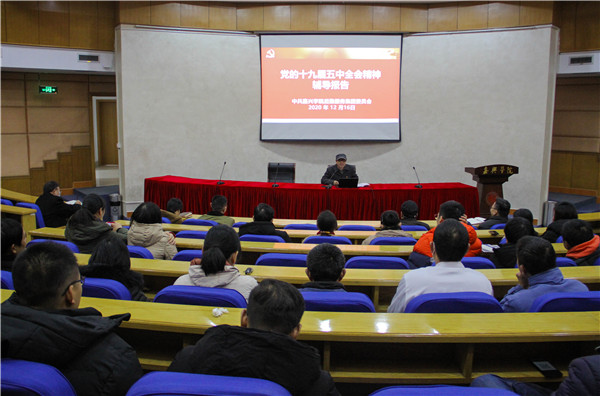 报告会上,徐云庆围绕“从历史和全局的高度深刻认识党的十九届五中全会的重大意义”、“深刻领会党的十九届五中全会的丰富内涵和精髓要义”以及“深入学习贯彻中央和省委决策部署,谋划实施好学校未来发展蓝图”三大方面对党的十九届五中全会精神进行了宣讲,并结合当前形势就其中出现的党政热词进行了深入解读。