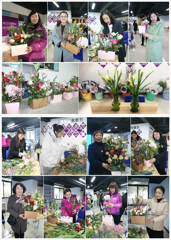 女职工们对插花表现出了极大的兴趣,大家相互交流,修剪花枝,整理花朵,构思扦插位置。优雅浪漫的玫瑰、甜美温馨的雏菊、清雅高洁的百合、神秘脱俗的桔梗……各色花枝在公寓员工们的巧手下变得充满诗情画意,大家开心的笑容也与花朵交相辉映。