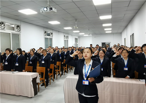 陈文真副书记宣布学生宿舍星级服务创建工作正式启动,90名基层管理人员、宿舍值班员、保洁员、维修员在一线党员、值班员代表李燕的带领下一起诵读岗位誓词,共同立下了“热爱岗位、守护安全、学生至上、言传身教”的铮铮誓言。