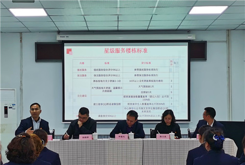 学生宿舍服务中心负责人介绍了星级服务标准体系,从星级楼栋、星级员工的评选标准入手,详细讲解了宿舍值班、保洁、文化建设等方面的要求和标准。汤晓荣副总经理指出,学生宿舍是学生生活的重要场所,宿舍工作人员是学生成长的重要引路人,学生宿舍服务育人工作是学校“三全育人”工作的重要一环;实施学生宿舍星级服务也是学校物业标准化专业化管理的要求,是后勤集团着力落实的民生实事,是今后很长一段时间内学生宿舍服务工作的努力方向和前进目标。