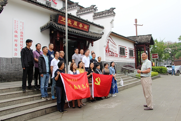 下午2点,后勤党员带着党微,整齐走进战旗村党群广场,“牢记嘱托 感恩奋进”,“火车跑得快,全靠车头带”,“三问三亮”把共产党人的作用发挥出来了等标语赫然进入眼帘。考察人员在广场合影留念后,聚集在宣传栏前静听导游介绍战旗村的有关情况。
