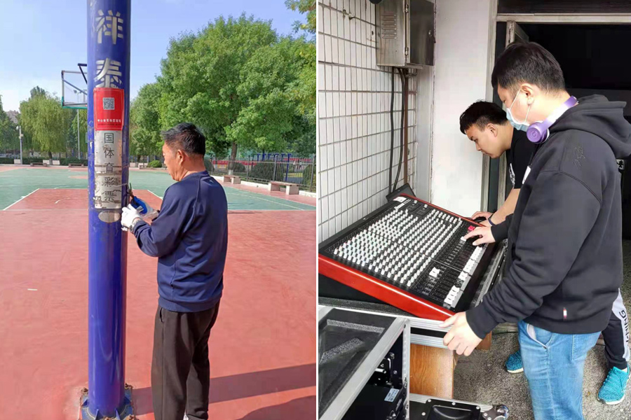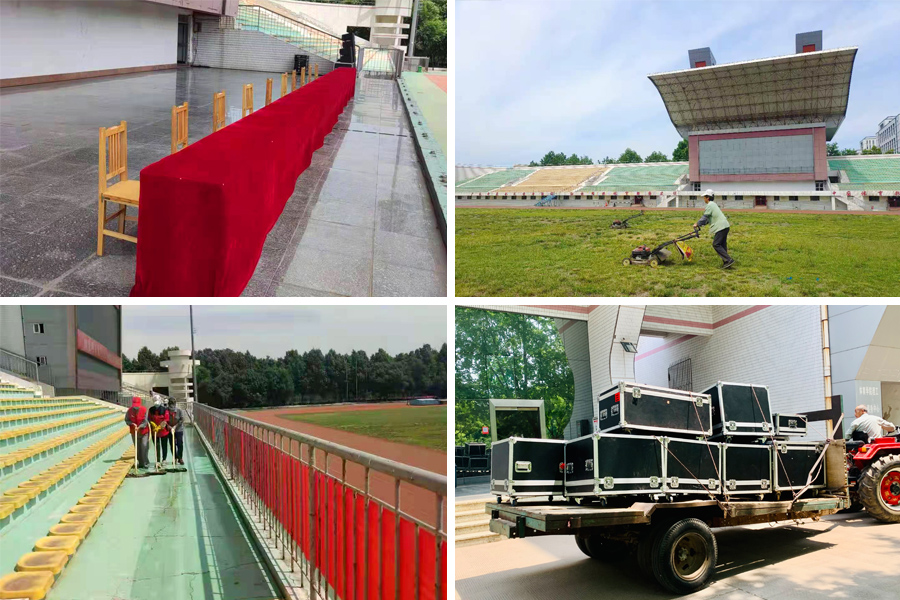 活动前期,负责准备现场的音响设备,做好彩排音响服务;布置主席台,摆放课桌13张、座椅20把;重点拖洗篮球场、网球场、排球场,采用人工加扫路车方式保洁体育场内、体育场西路、杏园路、篮球场、器械厂、排球网球场,并在周边增设6个垃圾桶;精细保洁二体看台、主席台、玻璃门、楼梯、裁判台、厕所卫生,用高杆铲刀清理小广告;检修二体旗杆。