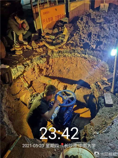 5月20晚上9:00,水电运行站供水工作技术人员在校本部米塔尔楼前全体就位,随着挖掘机启动,阀门更换工作正式开始。在水电运行站副站长唐凯新、技术人员张国祥的指导下,两名工人钻进主阀门井中,人机配合同时开挖,交替作业、有序进行。