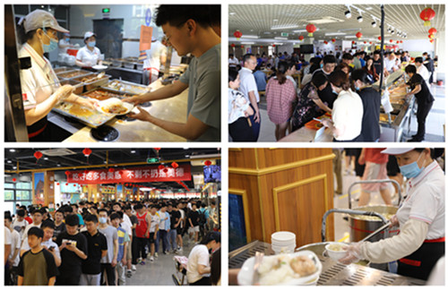同时间,桃苑餐厅和松苑餐厅的供鱼窗口处也排满了前来品鱼的学生。11:20,随着第一份“校庆鱼”的发放,供应正式开始,学生们有序地排着队伍,时不时探头张望,偶尔吞一吞口水,大家都期盼着尽快品尝到学校的美味。在教工餐厅,同样是“人山人海”,教职工们一边交流着“吃鱼心得”,一边畅想着学校发展的美好愿景。“咱自家的鱼就是鲜!”一位老师兴致勃勃地吃着红烧鱼块,就着“鱼头豆腐汤”,连连咂嘴称赞。