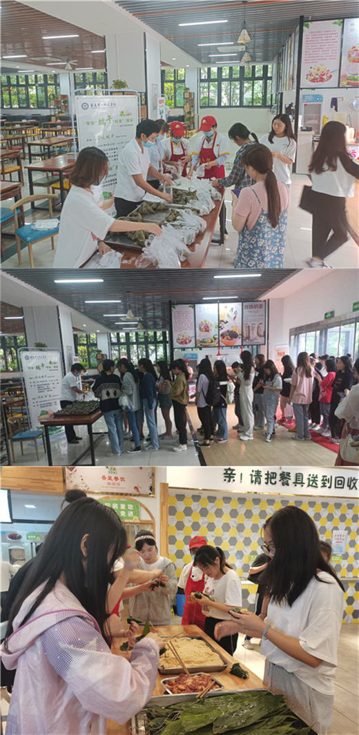 活动由基建后勤处主办,分为“品味端午”“传承‘粽意’”两个主题,分别在南山、学府大道两校区同时举行。到了中午,同学们惊喜地发现,今天的午餐中多了一道免费“菜品”——绿油油的飘香粽。