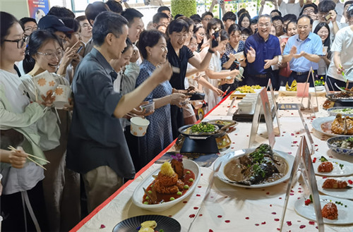 我校党委书记刘波书记在总务部领导的陪同下,来到“全鱼宴”展示台现场与现场师生亲切交流,看着这些色香味俱全的佳肴,在品尝过厨师们精心准备的部分菜肴后,12点整,刘波书记隆重宣布:“今天是矿大112岁的生日,祝贺矿大112岁生日快乐!同学们,吃鱼吧!”现场师生品尝,所展菜肴一倾而尽。