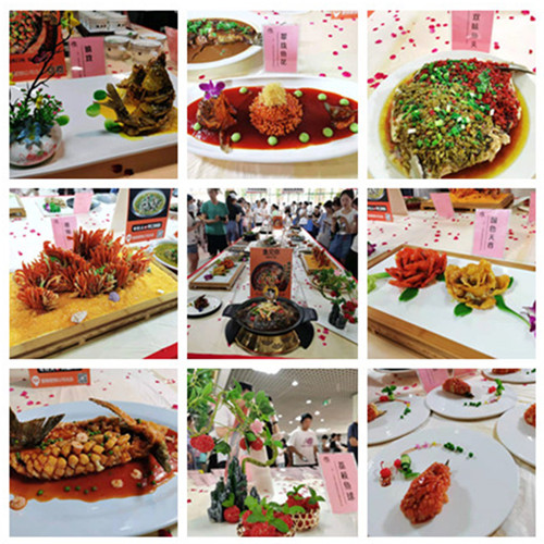 6月1日中午11点,全鱼宴展品陆续上架,最终展台上摆放了荔枝鱼球、国色天香、翠珠鱼花、刺猬鱼、金汤菊花盅、嬉戏等获奖作品,以及青花椒烤鱼、麻辣烤鱼、鲜椒鱼等多达二十三道色香味俱全的鱼类美食,展台周围被同学们围观的水泄不通。