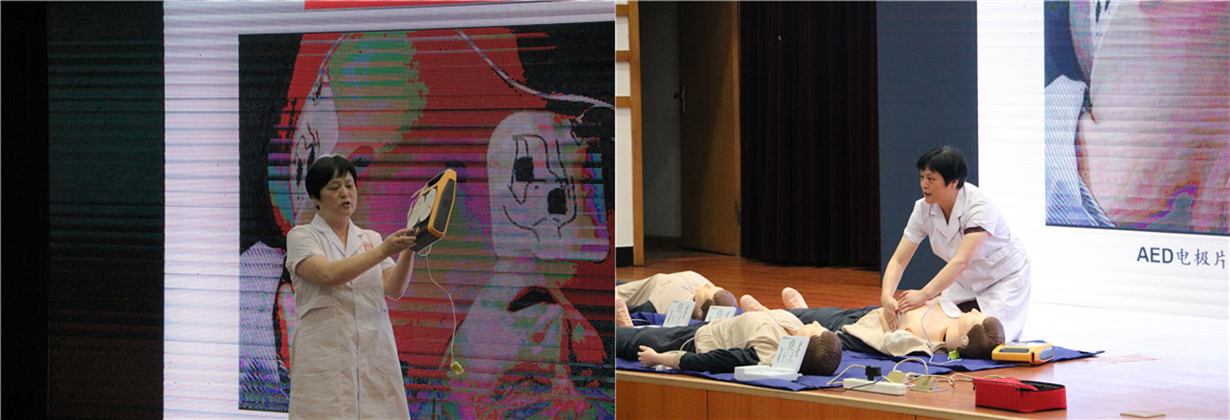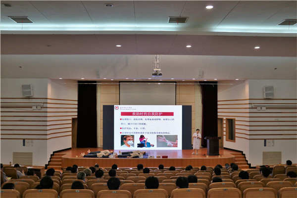 讲座采取急救知识培训、现场操作的方式进行,邀请市红十字会急救培训讲师朱明亚老师来校授课。朱明亚结合生动的案例,深入浅出地讲解了人们在生活中掌握急救方法的重要性以及现场救护的基本原则。她就心肺复苏的操作步骤进行了重点讲解,主要包括胸外按压、开放气道、人工呼吸3个关键步骤,并利用模拟人道具在现场进行了动作示范。随后,军训排卫生员学生上台进行了模拟操作,朱明亚给予了现场指导。整场讲座,气氛活跃、互动有序,取得了良好的培训效果。