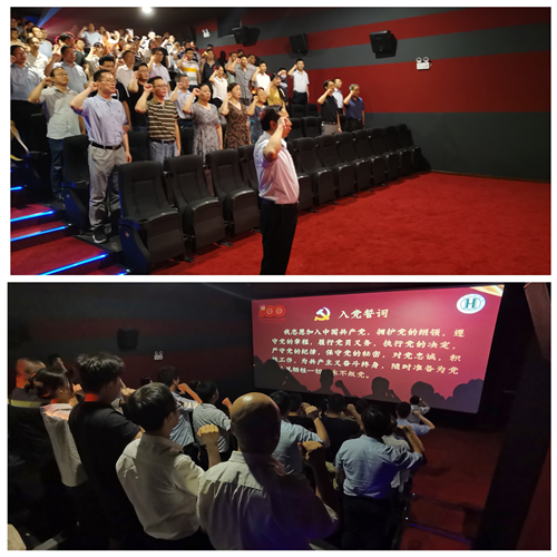 影片开始前,在后勤党委书记施爱平的领誓下,全体党员同志们举起右拳,面向党旗庄严宣誓,重温入党誓词。
