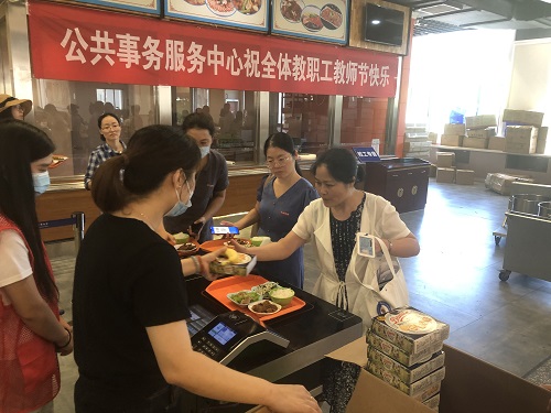 活动前期,公共事务服务中心精心准备,制作了教师节活动宣传海报,在教工餐厅悬挂了“祝福全体教职工教师节快乐”的横幅,营造浓厚的节日气氛。教师节当天,公共事务服务中心为前往食堂就餐的教职工们送上了一份印有“老师,您辛苦啦!”的精美礼物,并致以温馨的节日祝福。