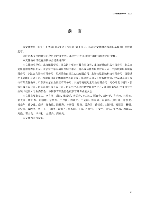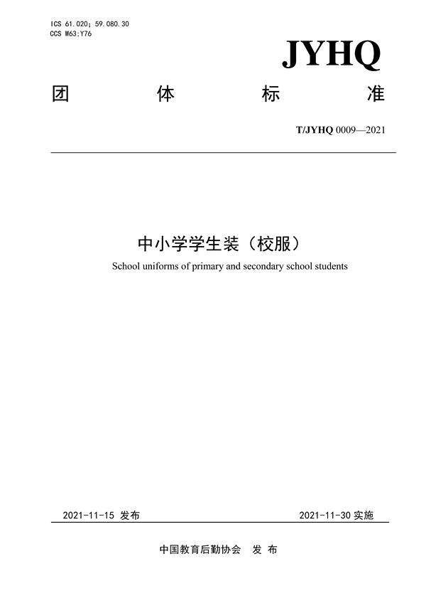 根据中国教育后勤协会团体标准制定计划,由北京服装学院、中国教育后勤协会校服管理专业委会等单位编制的《中小学学生装(校服)》团体标准,经协会组织专家审查,现批准发布,标准号为T/JYHQ 0009—2021,自2021年11月30日起实施。
