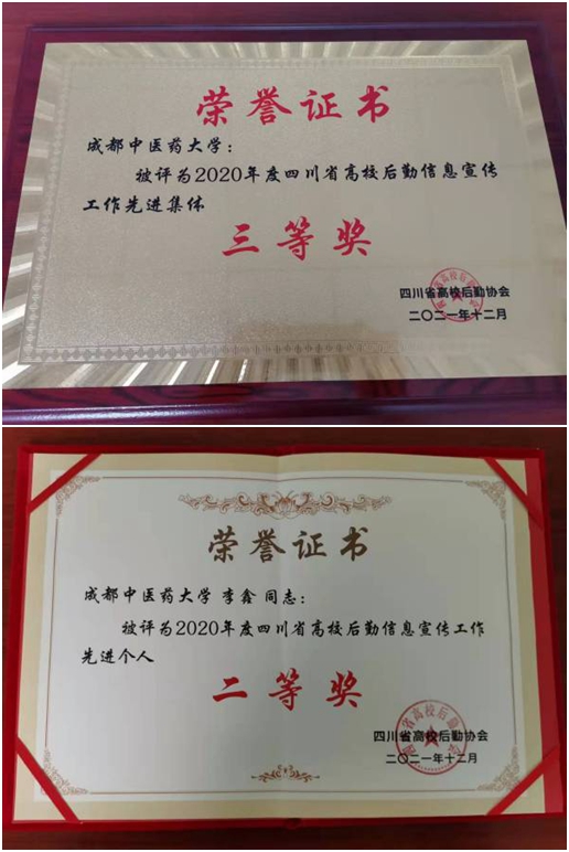12月7日,四川省高校后勤协会2020年度信息宣传表彰会暨通讯员培训会在金牛区教育宾馆举行。四川省学校基本建设与后勤产业中心副主任(主持工作)王国强、四川省高校后勤协会副会长蒲阳春等领导出席会议。会上表彰了2020年度四川省高校信息宣传工作先进集体13名、先进个人20名。成都中医药大学获得先进集体三等奖、成都中医药大学李鑫同志获得先进个人二等奖。