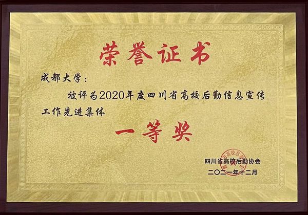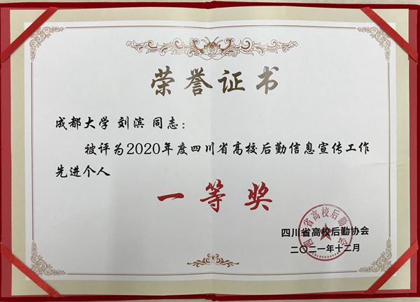 12月7日,四川省高校后勤协会2020年度信息宣传表彰会在成都教育宾馆隆重召开,成都大学后勤以突出的信息宣传成绩位列榜首,荣获先进集体一等奖,通讯员刘滨荣获先进个人一等奖。