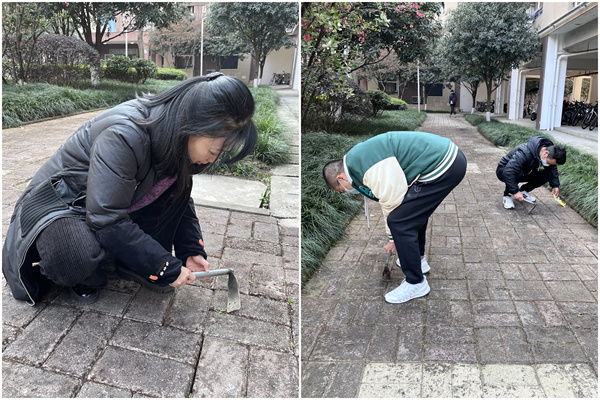 春日渐暖,杂草又开始在组团砖缝间萌发。宿舍管理中心党支部的党员们拿着小锄头、垃圾袋等,对这些杂草进行集中清理整治。除草、拔草、清理,大家分工明确,各项工作井然有序。经过一上午的努力,整齐的道路和美观的环境跃然眼前。