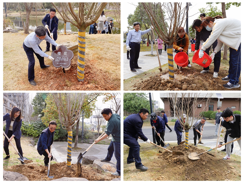 启动仪式后,大家随机组成9个小组,一起挥锹铲土、扶苗培土、提水浇灌,互帮互助、干劲十足,在空地上种下一棵棵充满生机的树苗。近1个多小时,共种植50棵日本早樱。经亨颐教育学院2019级学生陈瑞雅同学说:这是我第一次与老师们一起植树。从放置树苗到填土浇水,一铲又一铲,额头上流下的汗珠丝毫没有影响老师和同学们嘴角的笑容。就像老师对我说的“植树的经历难能可贵”,为春天的开篇种下一棵树苗,为校园的生活播种春光美好。