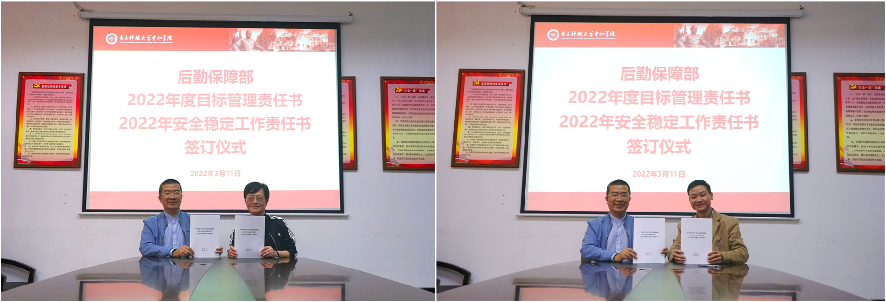 会上,后勤保障部主任苏志坚对《后勤保障部2022年工作要点》进行解读,并分别与各科室签订2022年度《目标管理责任书》及《安全稳定工作责任书》,要求全体人员明确目标、细化任务,以责任为导向落实安全稳定工作,扎实做好疫情防控、“绿色学校”创建等后勤保障服务工作。