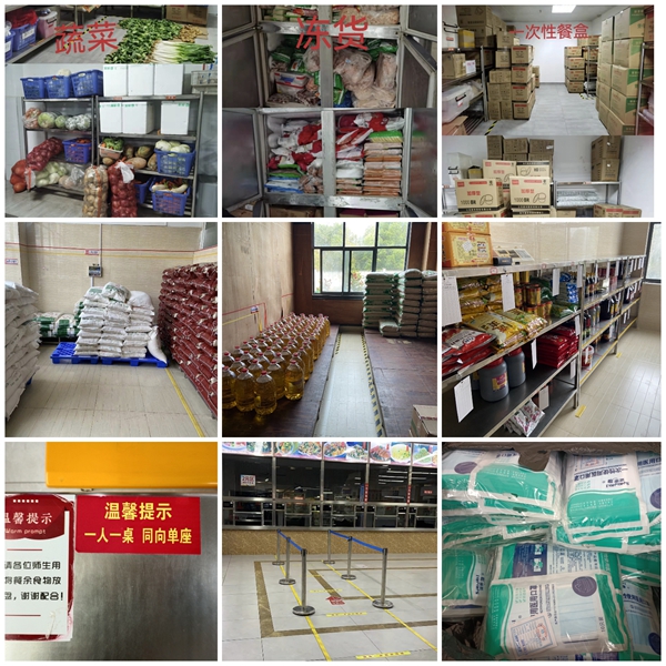 饮食中心提前做好食堂物资储备工作,确保留校师生的正常供餐,严格做好公共区域消杀、倡导师生自带饭盒就餐、设置排队一米线、要求就餐时同向单人单座,全力保障师生用餐安全。校园管理科提前储备消杀物资,增加学生宿舍、教学楼、图书馆、实验大楼等公共场所的消杀次数,安排保洁人员协助核酸检测医务人员完成场地布置以及现场环境卫生的清洁、消杀工作,加大环境卫生整治力度,确保校园干净整洁,此外,各宿舍楼门卫加强对进出人员的管理,严格执行体温检测、进门扫码等工作。招标采购中心克服重重困难,提前采购储备了医用口罩、消毒液、防护服、额温枪等防疫物资,并积极主动排查各供应商健康码、行程码,与集团各科室联系疫情防控物资采购事宜,及时将防疫物资配送到各校区,为疫情防控物资储备工作提供了有利保障。水电管理科对校园供水供电进行全面排查,确保设施设备的正常运行,每天安排工作人员24小时值守,时刻保障水电正常供给。交通服务中心随时待命,做好特殊时期的出行保障应急工作。督查室对相关部门防疫情况进行检查,并参与支援一线部门工作。