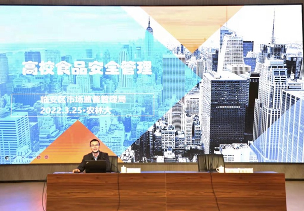 3月25日下午,浙江农林大学后勤服务中心2022年度春季安全稳定工作会议在衣锦报告厅召开。会议主要内容是贯彻落实学校和后勤中心关于加强校园安全的要求,总结回顾后勤中心2021年度安全质量工作,研究部署下一阶段安全稳定工作。临安区政府食品安全管理办公室副主任、区市场监督管理局党委委员潘忠华应邀出席并作校园食品安全讲座。后勤中心领导班子全体成员、全体中层干部、部门管理干部、部门主管、厨师长、班组长、安全员等参加会议,会议由后勤中心副主任钱潮主持。