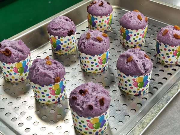现场教学后各小组各就其位,自己动手实践。同学们对照笔记内容,相互协作,精确量取原材料,搅拌、揉面、注模,大家热情高涨,忙得不亦乐乎。最后,一盘盘纸杯发糕成品被端上展桌,授课教师对同学们的作品进行了简单点评。随后,大家纷纷拍照留念并亲口品尝了各自的劳动成果,获得满满成就感。